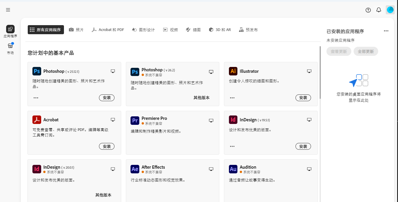 在Adobe Creative Cloud的安装没话说,直接懒人一顿操作,网速+电脑性能好的没几下就下载安装好了,没有什么技术可言。但是注意以下几点。